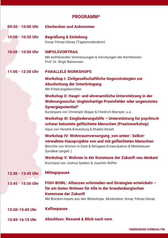 Geflüchtete Menschen, die in Brandenburg eine Wohnung suchen, stehen vielfach vor kaum unüberwindbaren Herausforderungen: Massiver Wohnungsmangel, Abhängigkeit von behördlicher Zustimmung, struktureller Rassismus auf dem Wohnungsmarkt. Es verwundert daher nicht, dass sich in diesem Feld vielfältige Unterstützungsstrukturen ausgebildet haben – sowohl haupt- als auch ehrenamtliche. Was dabei auffällt: Die beiden Akteursgruppen kommen selten in Kontakt und haben kaum direkte Berührungspunkte in ihrer Arbeit. Im Workshop teilen wir Erfahrungen aus beiden Perspektiven und fragen, ob und wie Unterstützung beim Auszug aus Gemeinschaftsunterkünften durch mehr Wissensaustausch und abgestimmte Zusammenarbeit wirksamer gestaltet werden könnte.